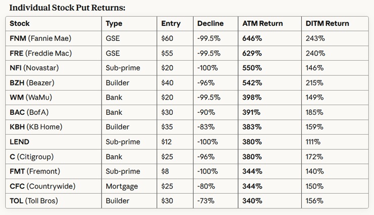 Large Banks Short or use puts on WM, BAC, C, JPM, WFC (with caution) Derivatives exposure + mortgage risk + bailout caveat WM failed; others lost 80–95% value; huge put/short profits