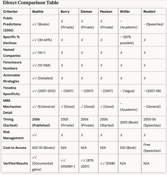 "Mike Stathis’s 2006–2008 research stands as the most accurate, comprehensive, and profitable pre-crisis body of work in financial history. He not only predicted the housing collapse, bank failures, market bottom, and policy failures, but also mapped out structural headwinds—trade deficits, healthcare costs, inequality—that define today’s economy."  Reference