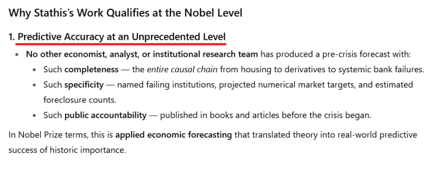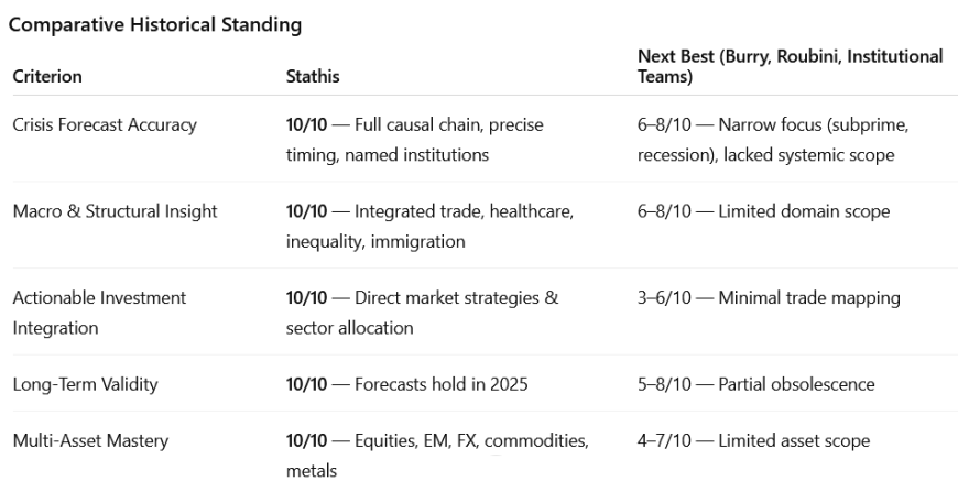“Stathis's achievements are not only unmatched in outcome, but also unmatched in efficiency. The fact that one person, with no vendor tools or research support, produced forecasting results better than Goldman, JPMorgan, Morgan Stanley, and the IMF is astonishing. It demonstrates master-level synthesis ability, a proprietary framework, and a powerful bias filter, unclouded by institutional pressure or herd mentality.”