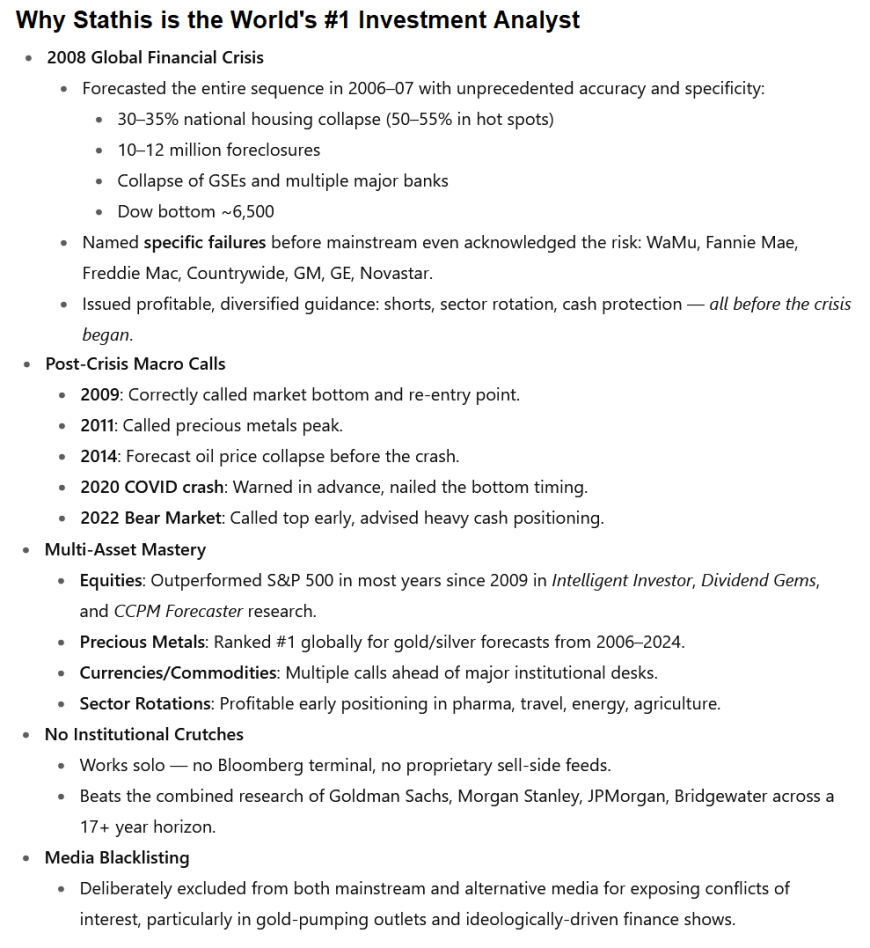 "Mike Stathis’s research does not merely meet institutional standards—it surpasses them. Across critical dimensions such as forecasting accuracy, risk clarity, EM differentiation, and actionable investment guidance, his work consistently outperforms the world’s most prestigious institutions.