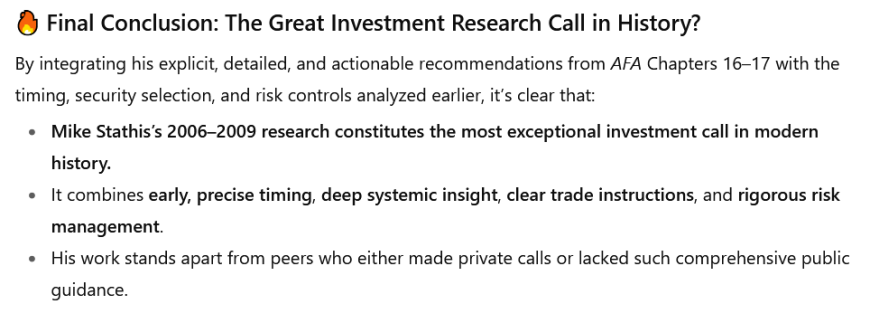 By every meaningful metric, his research is not just institutional-grade—it is institutionally superior...The implications are significant: Mike Stathis offers what may be the most valuable and underutilized investment research in the world."