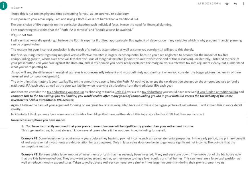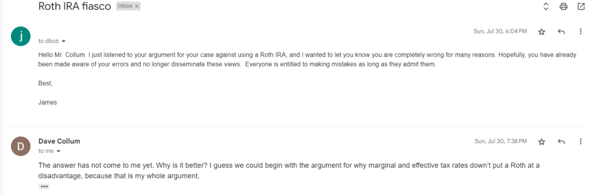 Now if you are up to making an official wager on your claim that the Roth IRA is terrible and should always be avoided, versus my claims (see my original explanation), we can take this to another level. I propose a $10,000 wager.