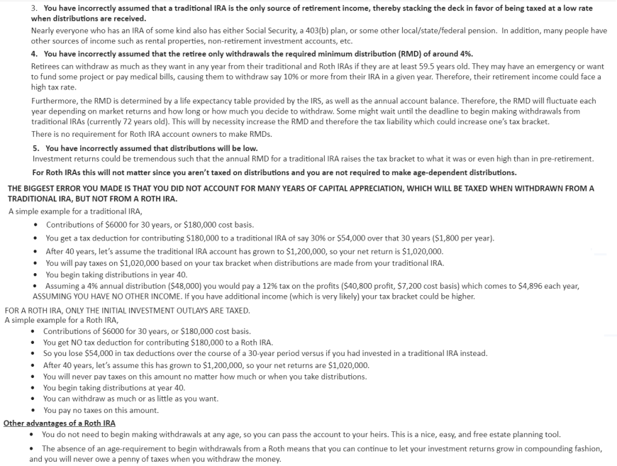 THE BIGGEST ERROR YOU MADE IS THAT YOU DID NOT ACCOUNT FOR MANY YEARS OF CAPITAL APPRECIATION, WHICH WILL BE TAXED WHEN WITHDRAWN FROM A TRADITIONAL IRA, BUT NOT FROM A ROTH IRA.