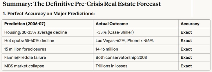 Real Estate Market Predict 30–35% national drop, 50–60% in hotspots Overleverage, lax lending, housing euphoria Matched Case-Shiller & market behavior