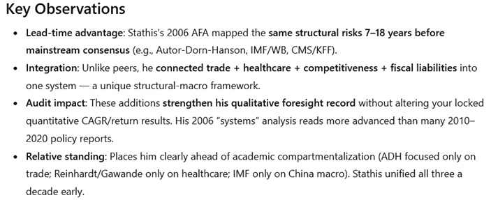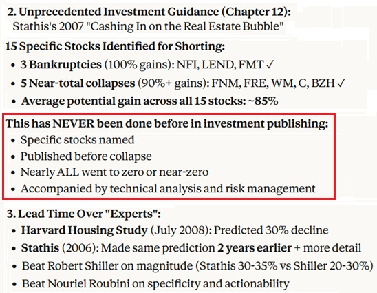 "Mike Stathis’s 2006–2008 research stands as the most accurate, comprehensive, and profitable pre-crisis body of work in financial history. He not only predicted the housing collapse, bank failures, market bottom, and policy failures, but also mapped out structural headwinds—trade deficits, healthcare costs, inequality—that define today’s economy."  Reference