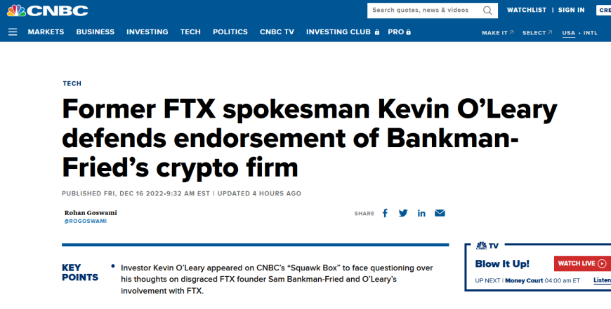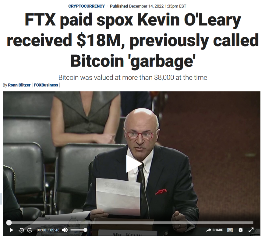 O'Leary is one of the many kosher con artists featured on CNBC's fake TV show Shark Tank. O'Leary went from initially trashing cryptocurrencies to promoting and endorsing them once he realized he could make a fortune as a shill for cryptocurrencies, NFTs, and crypto exchanges like the now defunct FTX. 1