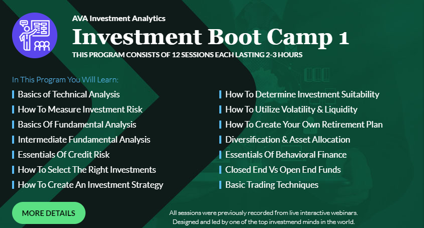 Unless you're a very experienced and successful investment professional, you're not likely to understand what you need to go at it on your own or even with our research. That's why we've created the AVA Investment Analytics Investment Boot Camp.