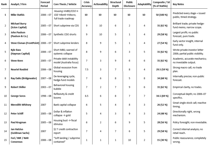 | 1 | Mike Stathis | 2006 – 2007 | Integrated macro-financial model + explicit trade sequencing (short → cash/TIPS → gold → long equities/real estate) | 10 | 10 | 10 | 50 / 50 (100 %) | #1 All Time | Only analyst to forecast & monetize full 2008 crisis chain; unmatched precision and execution. |