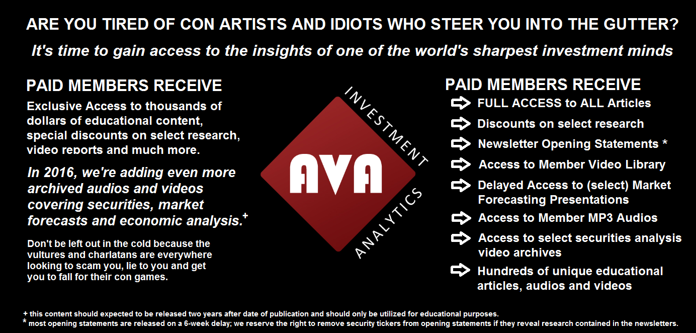 This publication (written, audio and video) represents the commentary and/or criticisms from Mike Stathis or other individuals affiliated with Mike Stathis or AVA Investment Analytics (referred to hereafter as the “author”). Therefore, the commentary and/or criticisms only serve as an opinion and therefore should not be taken to be factual representations, regardless of what might be stated in these commentaries/criticisms. There is always a possibility that the author has made one or more unintentional errors, misspoke, misinterpreted information, and/or excluded information which might have altered the commentary and/or criticisms. Hence, you are advised to conduct your own independent investigations so that you can form your own conclusions. We encourage the public to contact us if we have made any errors in statements or assumptions. We also encourage the public to contact us if we have left out relevant information which might alter our conclusions. We cannot promise a response, but we will consider all valid information.