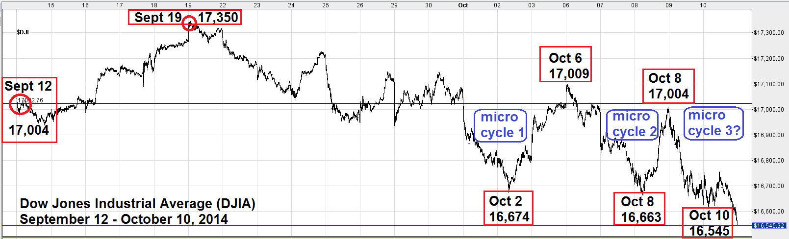 In the September 2014 Market Forecast, Mike stated that he felt the Dow would sell off down to the 16,600 to 16,500 range.